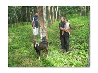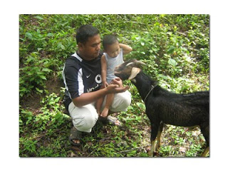 Balik umah opah kat temin..suka sgt le adik..sbb ada mcm2 kt umah pah tu..arnab,kambing,kura2,kera...dengan kambing nmpk dr jauh mc berani...tp bila suh pegang takut le plak adik tue...gambaq nie yg sempat ibu rakam adik ngn kambing2 tok.
